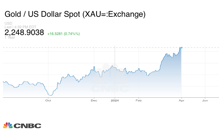 ارتفعت أونصة الذهب بنسبة 0.3% لتتداول عند 2,240.04 دولاراً.