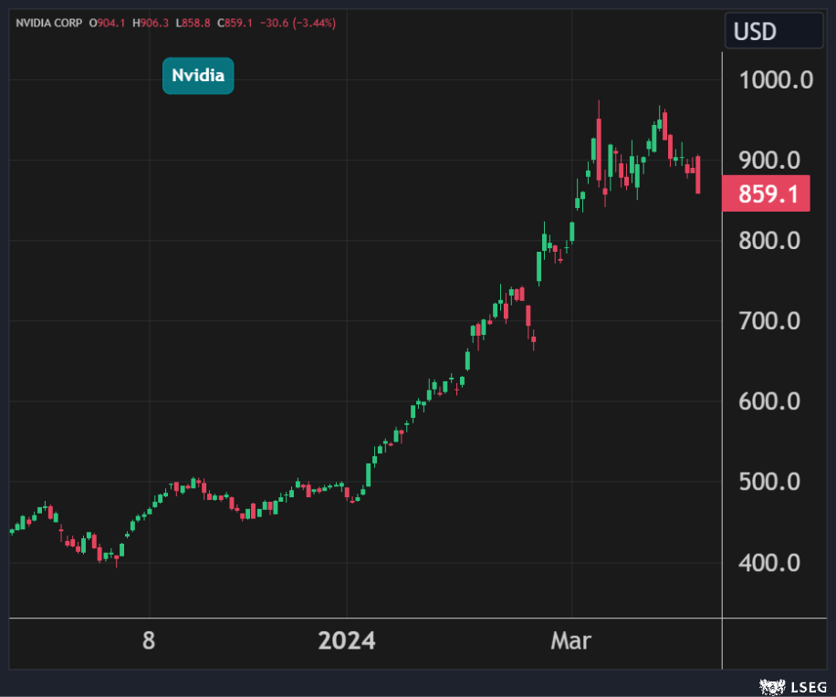 وتأتي خسائر سهم Nvidia وسط انخفاض شبه جماعي لأسهم التكنولوجيا الكُبرى الحساسة لمعدلات الفائدة المرتفعة بعد التوقعات الحذرة لمسؤولي الفدرالي حول موعد وعدد مرات الخفض للعام الحالي وقبيل التقرير المرتقب لبيانات الوظائف في الولايات المتحدة غداً الجمعة.