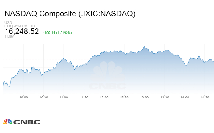 وارتفع مؤشر Nasdaq المركب عند الإغلاق 199.44 نقطة بنسبة 1.24% إلى مستوى 16248.52 نقطة.