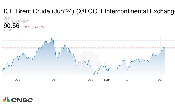 وتراجع خام برنت لعقد تسليم يونيو/ حزيران 63 سنتاً، أو 0.69%، إلى 90.54 دولاراً للبرميل.