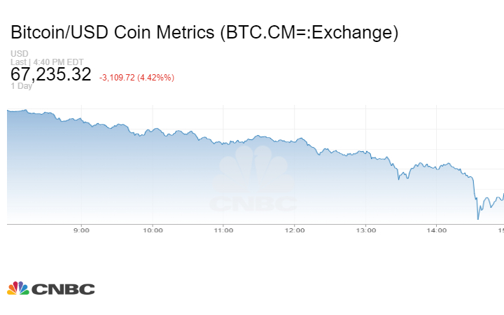 وسجلت العملة المشفرة انخفاضاً خلال تعاملات آخر 24 ساعة 3110 دولارات بنسبة 4.42% إلى مستوى 67235.32 دولار في الساعة 8:40 مساء اليوم بتوقيت جرينتش.