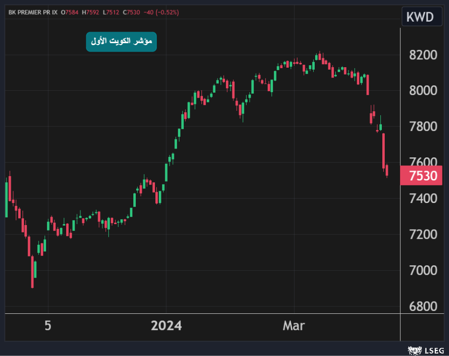 و تراجع مؤشر الكويت الأول بنحو 0.5% مسجلاً أدنى إغلاق له منذ بداية العام الحالي بضغط من انخفاض سهمي وطني وبيتك بنسبة 1.6% و0.7% على التوالي.