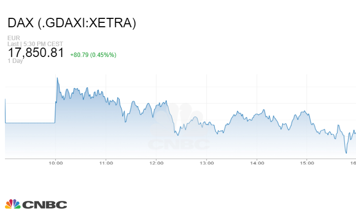 وأغلق مؤشر DAX الألماني على ارتفاع 80.79 نقطة أو بنسبة 0.45% إلى مستوى 17850.81 نقطة.