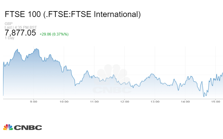 وصعد مؤشر FTSE 100 البريطاني 29.06 نقطة أو بنسبة 0.37% في نهاية التعاملات إلى مستوى 7877.05 نقطة.