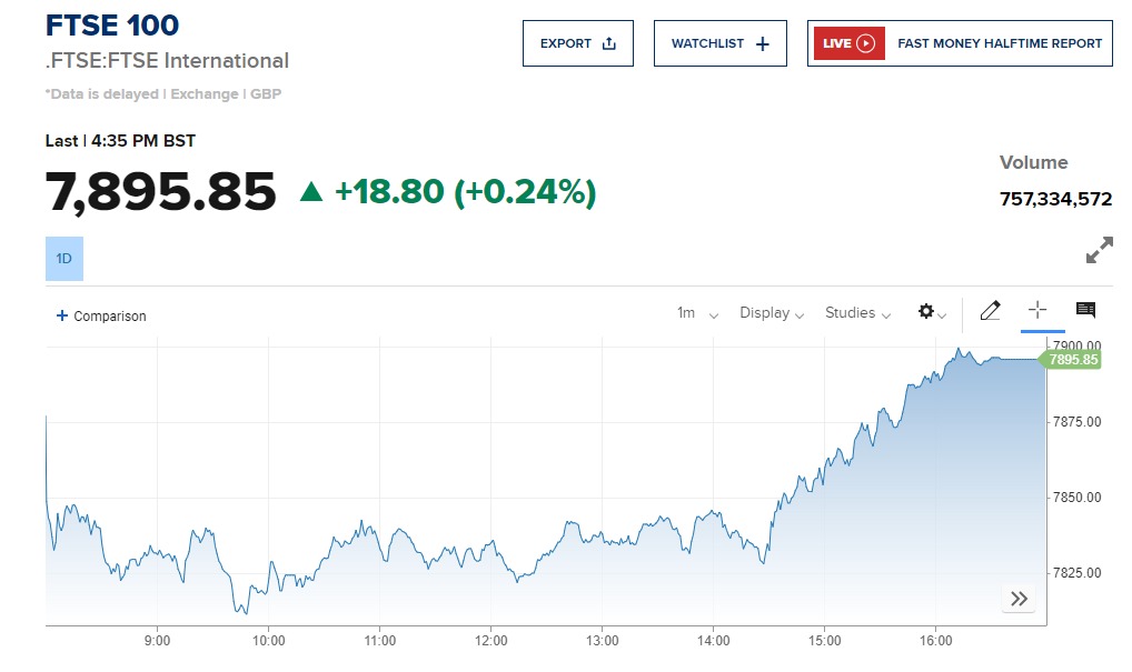 بينما صعد مؤشر FTSE 100 البريطاني 18.80 نقطة أو بنسبة 0.24% في نهاية التعاملات إلى مستوى 7895.85 نقطة.