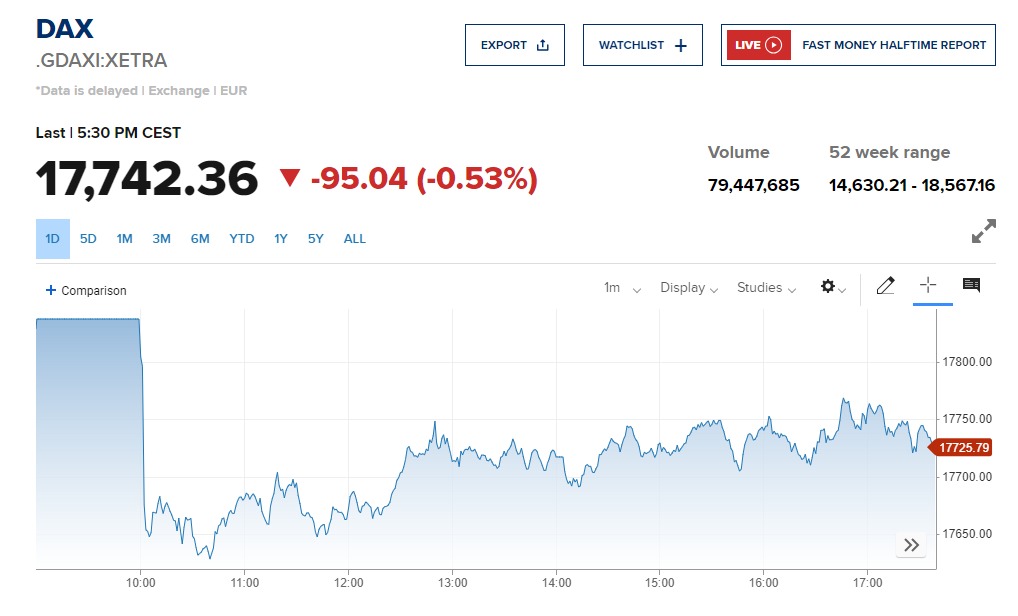 وأغلق مؤشر DAX الألماني على انخفاض 95.04 نقطة أو بنسبة 0.53% إلى مستوى 17742.36 نقطة.