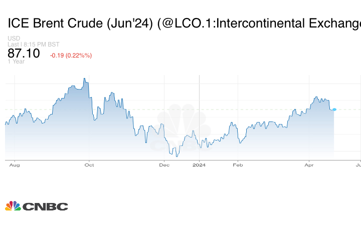في حين انخفضت العقود الآجلة لخام برنت عقد تسليم شهر يونيو/ حزيران 29 سنتاً إلى 87 دولاراً للبرميل.