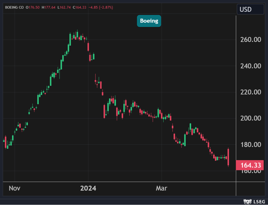 تراجع سهم Boeing بنسبة 3% في جلسة الأربعاء ليهوي إلى أدنى مستوياته في 18 شهراً، لتفقد الشركة نحو 3 مليارات دولار من قيمتها السوقية في يوم واحد.