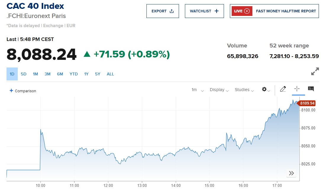 وارتفع مؤشر CAC 40 الفرنسي 71.59 نقطة أو بنسبة 0.89% إلى مستوى 8088.24 نقطة.