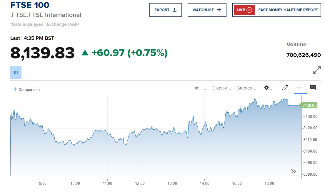 وصعد مؤشر FTSE 100 البريطاني 60.97 نقطة أو بنسبة 0.75% في نهاية التعاملات إلى مستوى 8139.83 نقطة.