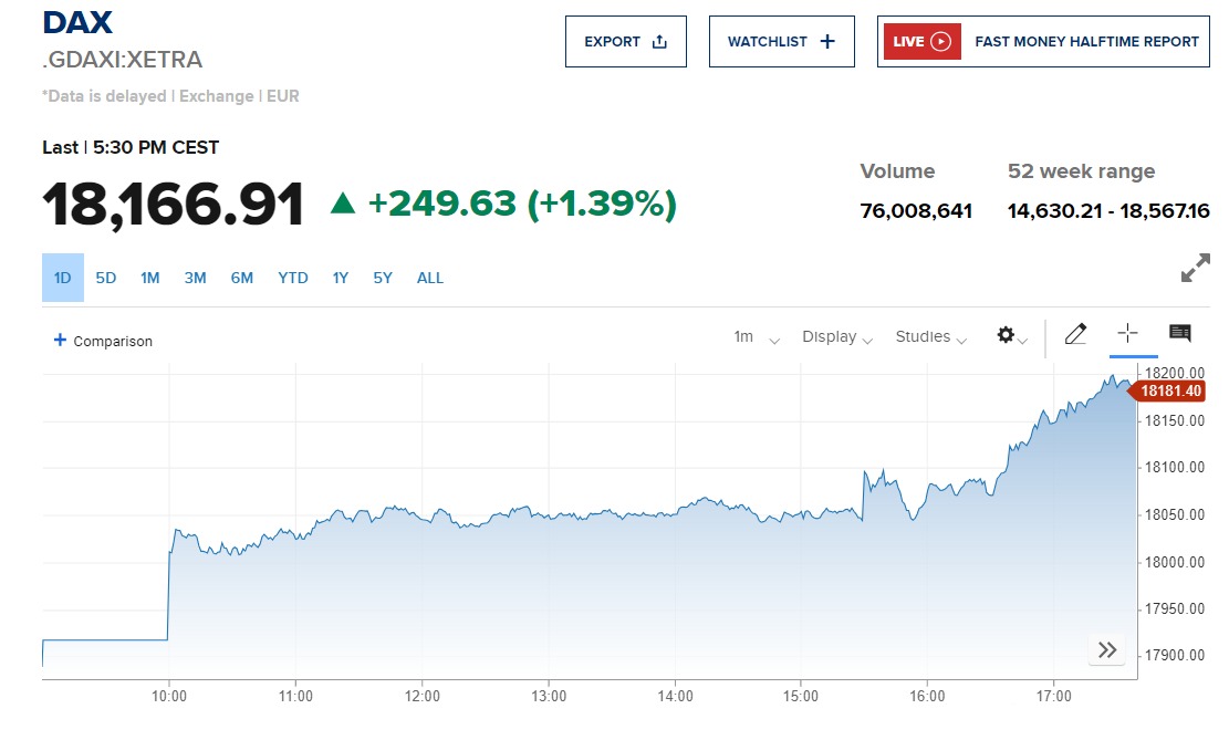 وأغلق مؤشر DAX الألماني على ارتفاع 249.63 نقطة أو بنسبة 1.39% إلى مستوى 18166.91 نقطة.