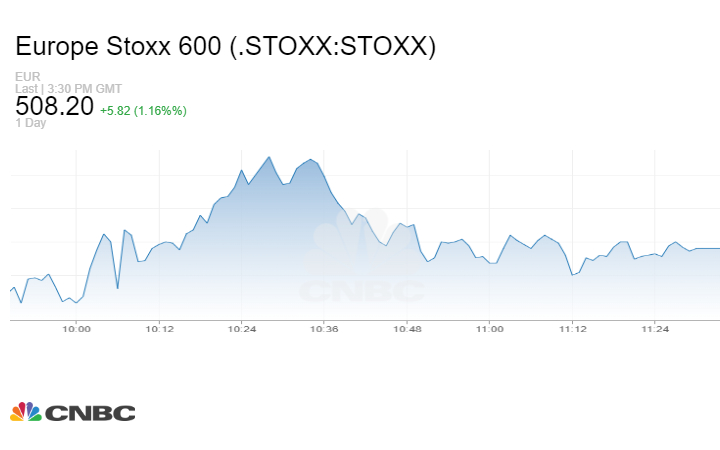 وارتفع مؤشر STOXX 600 الأوروبي عند الإغلاق 5.82 نقطة أو بنسبة 1.16% إلى مستوى 508.20 نقطة، مع تسجيل أغلب القطاعات والأسهم الرئيسية ارتفاعات. وقادت أسهم البناء والمواد المكاسب، مرتفعة بنحو 2.1%، في حين تراجعت أسهم الكيماويات بنسبة 0.3%.