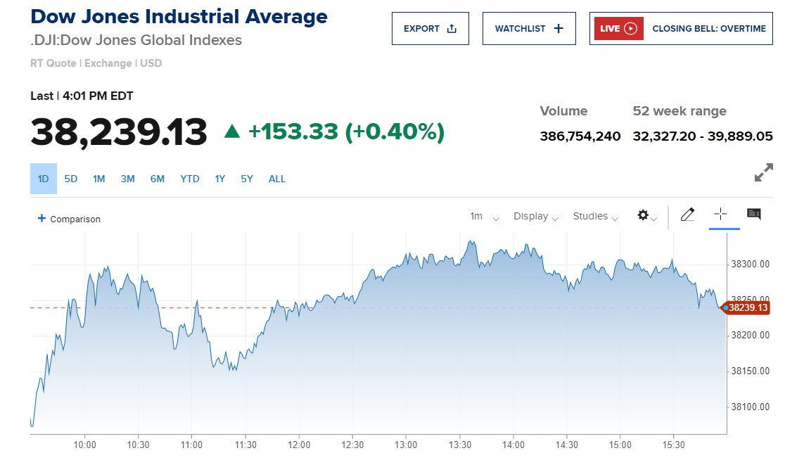 ارتفع مؤشر Dow Jones الصناعي 152.33 نقطة، أو 0.4% في نهاية تعاملات الجمعة إلى مستوى 38239.13 نقطة.