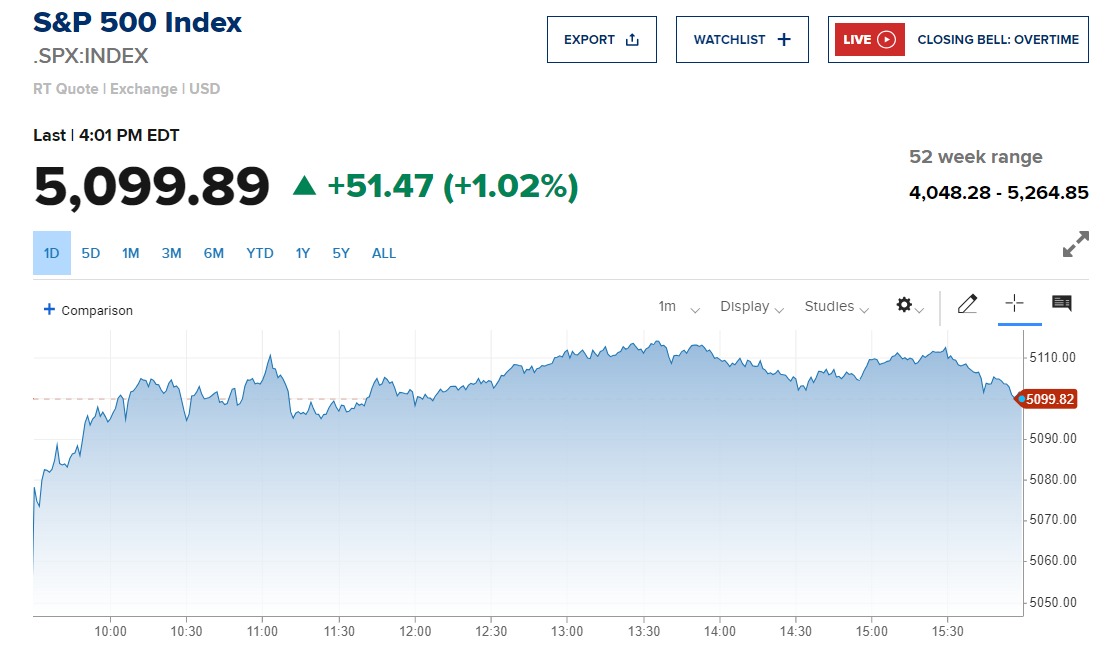 كما أغلق مؤشر S&P 500 على ارتفاع 51.47 نقطة أو بنسبة 1.02% إلى مستوى 5099.89 نقطة.