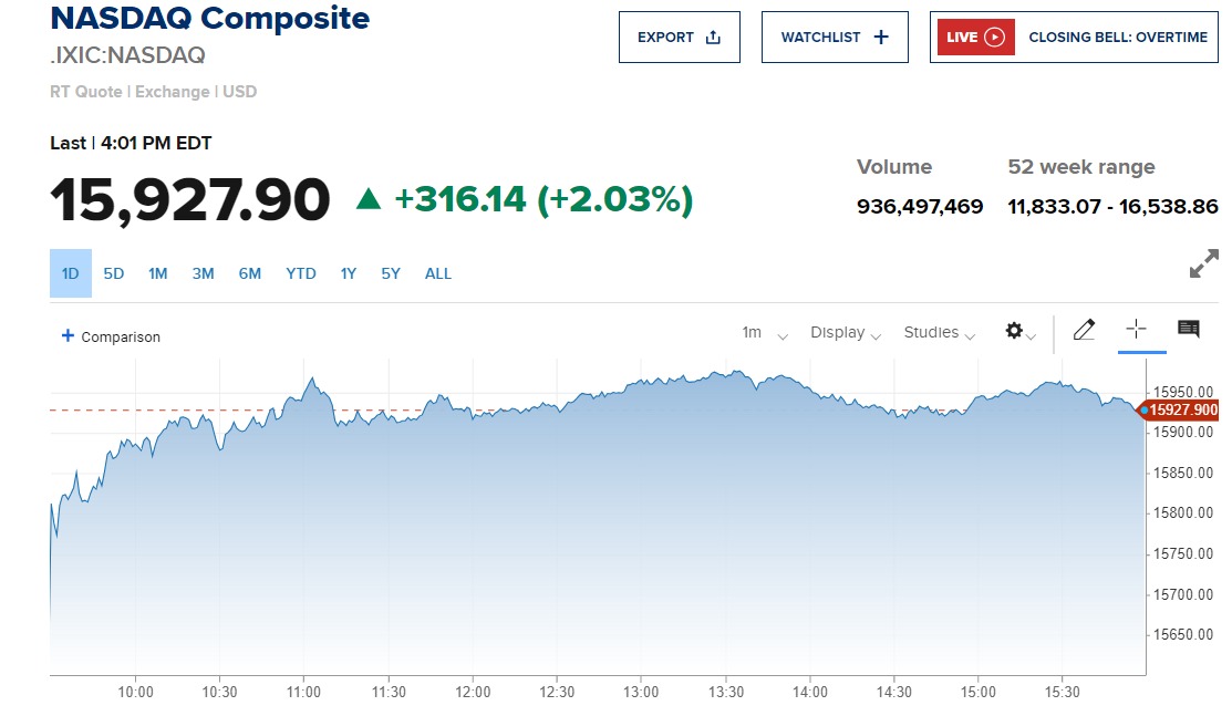 وارتفع مؤشر Nasdaq المركب 316.14 نقطة أو بنسبة 2.03% عند الإغلاق إلى مستوى 15927.9 نقطة.