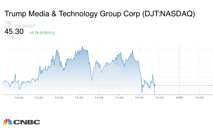 ارتفع مؤشر DJT بأكثر من 5 دولارات للسهم قبل الساعة الواحدة ظهراً بتوقيت نيويورك.