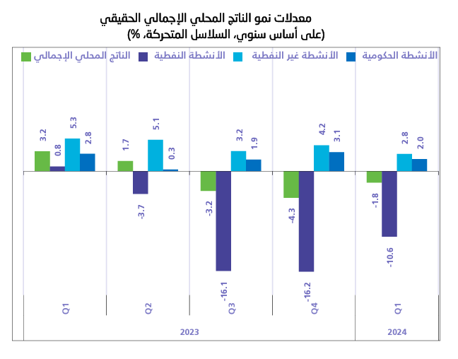 وجاء هذا النمو مدفوعاً بارتفاع الأنشطة النفطية بـ 2.4%، إضافة إلى نمو الأنشطة غير النفطية بـ 0.5%، بينما تراجعت الأنشطة الحكومية بـ 1%.