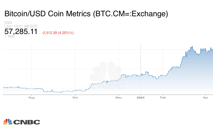 وانخفضت العملة المشفرة بما يصل إلى 7% إلى 56526.00 دولاراً، وهو أدنى مستوى لها منذ 27 فبراير/ شباط، وفقاً لموقع CoinMetrics. وإلى أن عادت منذ قليل إلى انخفاض بنحو 4% إلى 57413.94 دولاراً.