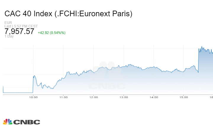 وصعد مؤشر CAC الفرنسي 42.92 نقطة أو بنسبة 0.54% إلى مستوى 7957.57 نقطة.