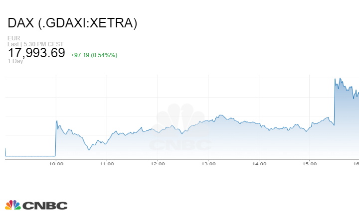 وارتفع مؤشر DAX الألماني 97.19 نقطة أو بنسبة 0.54% مع نهاية التعاملات إلى 17993.69 نقطة.