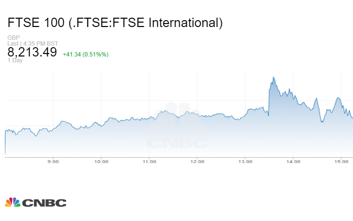 وسجل مؤشر FTSE 100 البريطاني ارتفاعاً 41.34 نقطة أو بنسبة 0.51% عند الإغلاق إلى 8213.49 نقطة.
