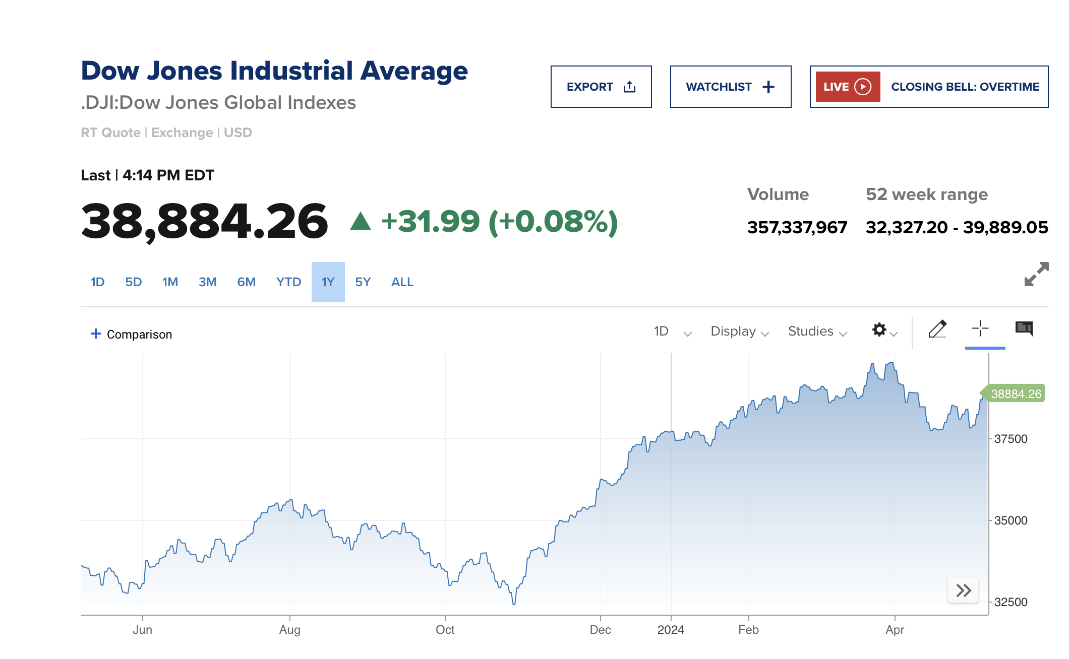 وصعد مؤشر داو جونز المكون من 30 سهماً 31.99 نقطة أو 0.08% ليغلق عند 38884.26 نقطة. وبختام هذه الليلة يكون ارتفع مؤشر الأسهم القيادية لليوم الخامس مسجلاً أطول سلسلة مكاسب له منذ ديسمبر/ كانون الأول.