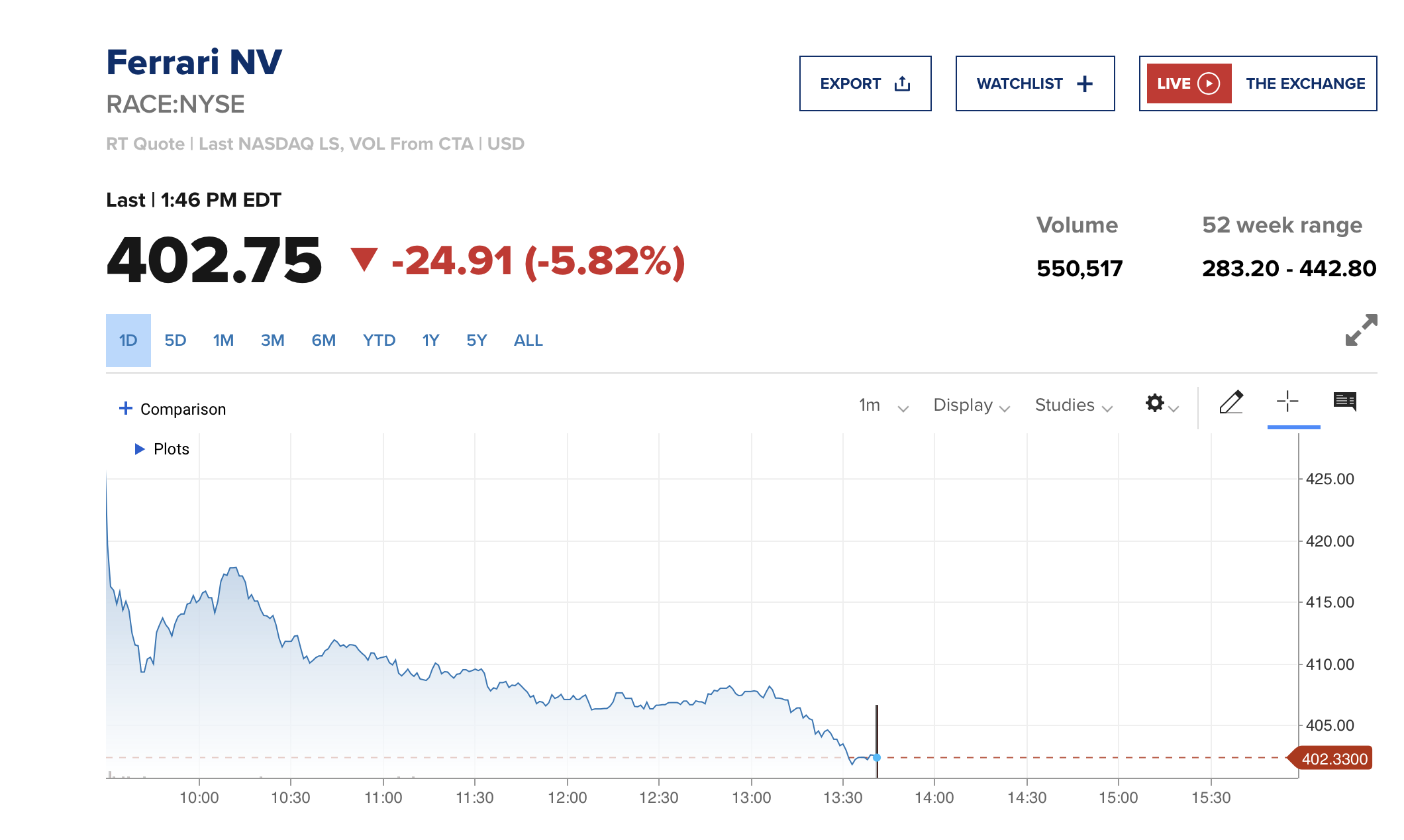 وانخفضت الأسهم بنحو 5% في تعاملات بعد الظهر. إذا استمر هذا الأمر حتى إغلاق الجلسة، فسيكون هذا أسوأ يوم له منذ يونيو/ حزيران 2022، عندما انخفض السهم بنحو 5.7%. (المزيد من التفاصيل: ارتفاع أرباح فيراري بـنحو 13% إلى 605 ملايين يورو