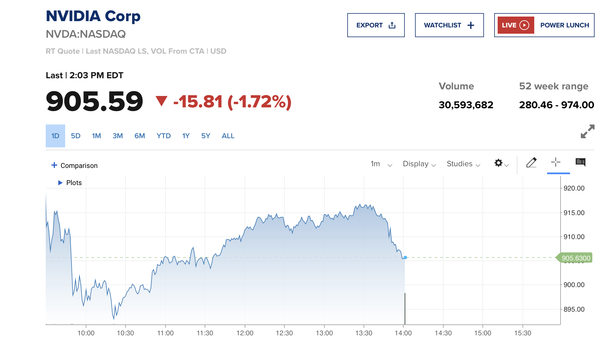 تراجعت أسهم شركة الرقائق الإلكترونية إنفيديا Nvidia بنحو 1%، بعد إعلان المستثمر والملياردير ستانلي دروكينميلر في برنامج Squawk Box على قناة CNBC أنه خفض حصته في شركة صناعة الرقائق في أواخر مارس/ آذار، قائلاً إن الذكاء الاصطناعي قد يكون "مبالغاً فيه قليلاً على المدى القصير". (المزيد من التفاصيل: تصريحات تهبط بأسهم إنفيديا.. ما الذي خسّر عملاقة الرقائق؟)