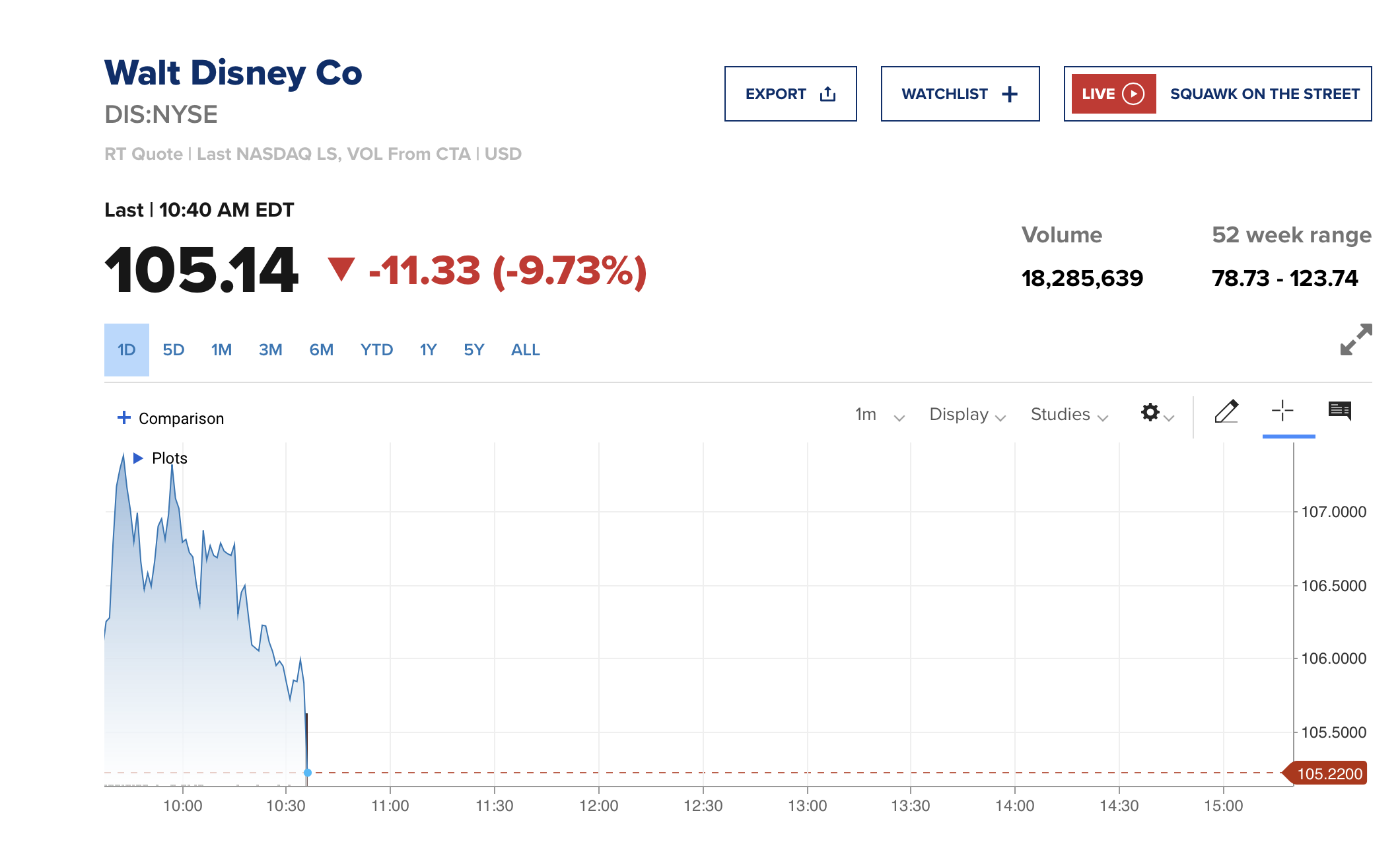 انخفضت أسهم شركة ديزني Disney بأكثر من 8% بعد أن سجلت شركة الإعلام والترفيه العملاقة خسارة طفيفة في الإيرادات لكنها تجاوزت توقعات الأرباح الفصلية. ( المزيد من التفاصيل: أرباح ديزني للربع الثاني ترتفع بأكثر من التوقعات)