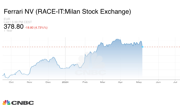لكن انخفضت أسهم فيراري بنسبة 4.3% في التعاملات المبكرة بعد الظهر، على الرغم من إعلان شركة صناعة السيارات الرياضية عن ارتفاع الإيرادات والأرباح على أساس سنوي بنسب مئوية مضاعفة في الربع الأول.