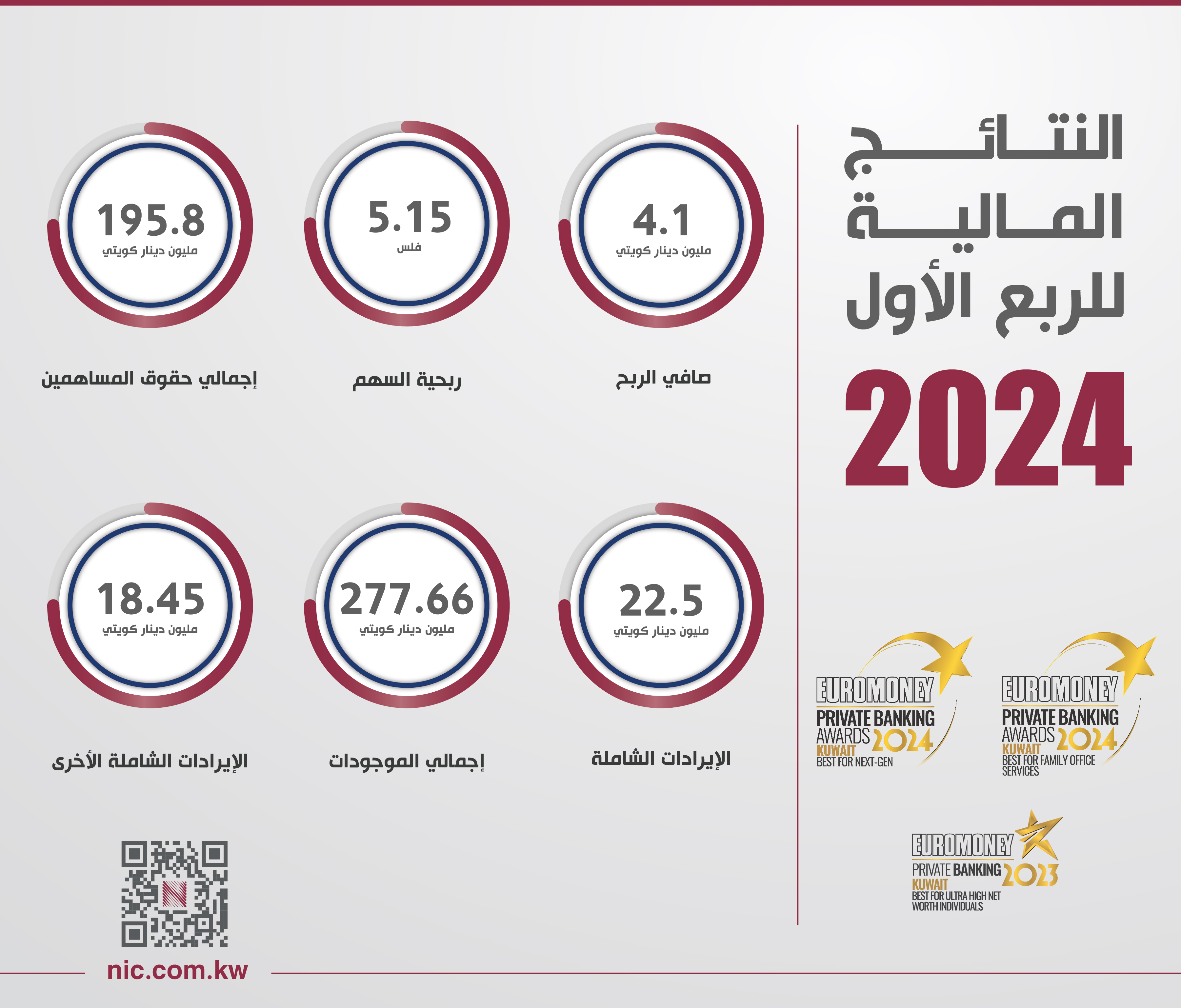 ارتفع صافي أرباح شركة الاستثمارات الكويتية في الربع الأول 2024 بـ 282% إلى 4.1 مليون دينار كويتي وبواقع 5.15 فلس للسهم الواحد، مقارنة بنفس الفترة لعام 2023 عندما بلغ صافي الأرباح 1.07 مليون دينار كويتي بواقع 1.3 فلس للسهم الواحد.