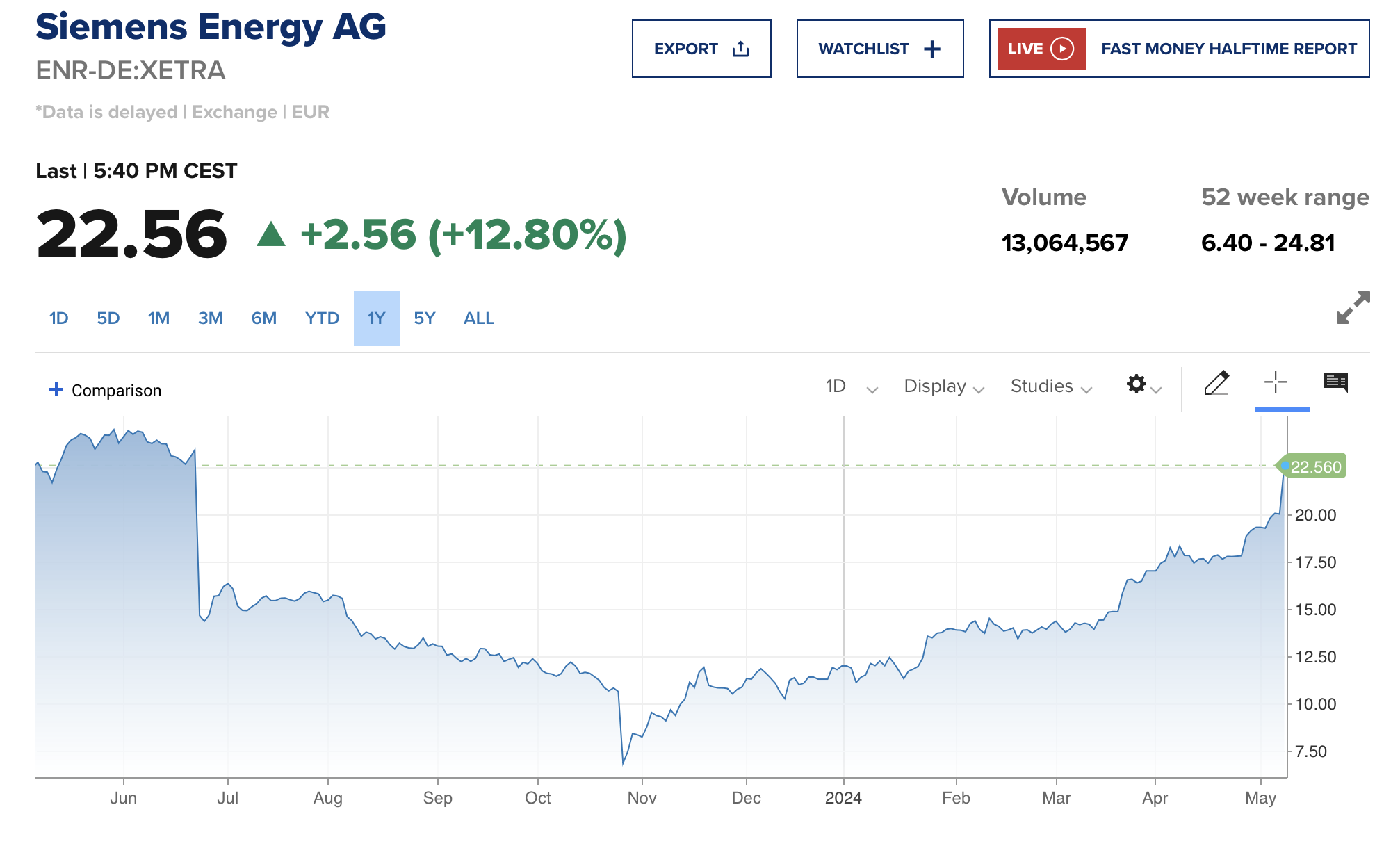 وفي الوقت نفسه، ارتفعت أسهم شركة سيمنز Siemens للطاقة الألمانية وقفز السهم 12.8% بعد أن رفعت الشركة توقعاتها لعام 2024 على خلفية قوة أعمالها المتعلقة بشبكات الكهرباء.