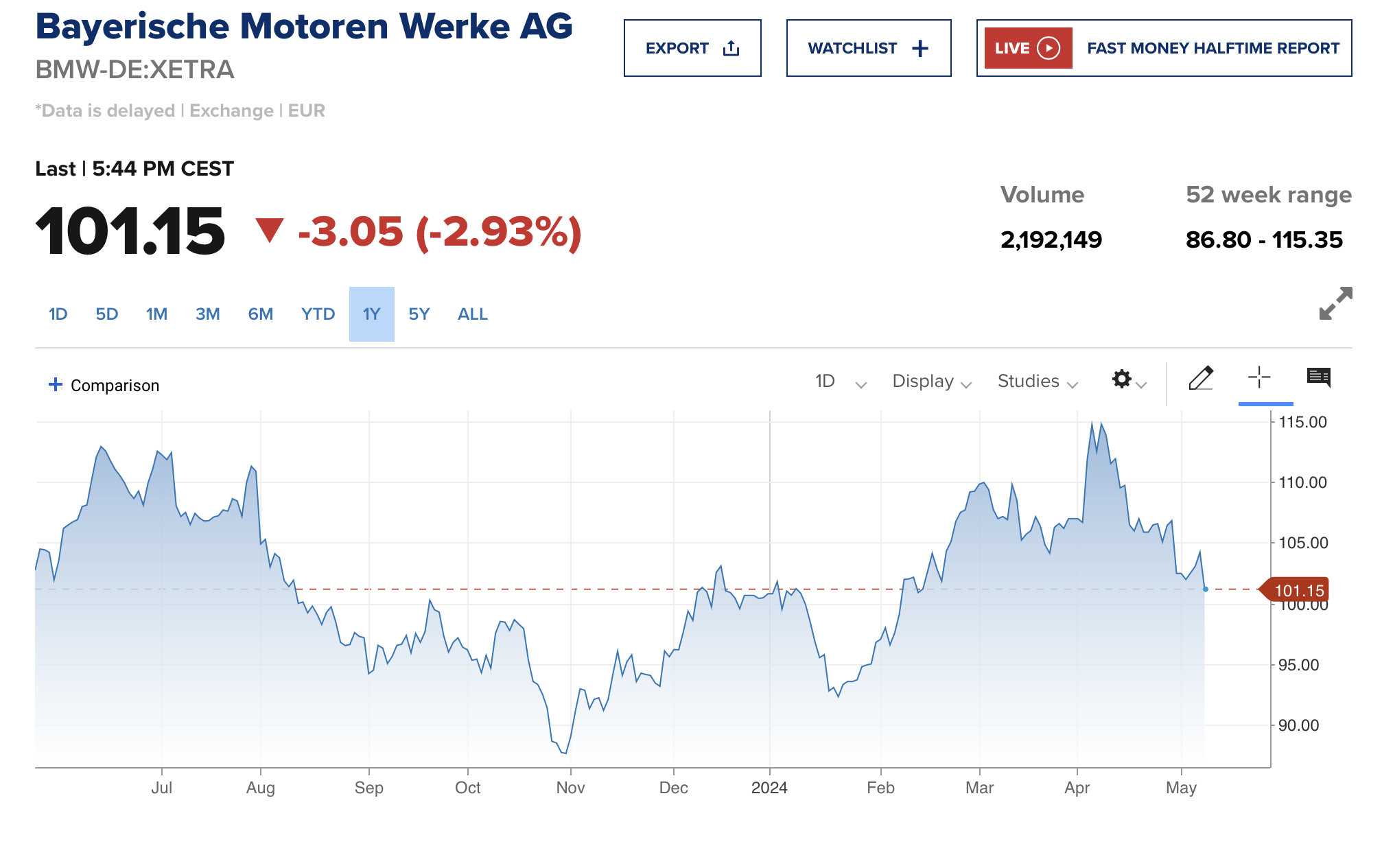 وانخفضت أسهم شركة بي إم دبليو BMW نحو 3% بعد أن أعلنت الشركة عن انخفاض هامش ربح الربع الأول وسط ارتفاع التكاليف وضعف الطلب على سياراتها الفاخرة.