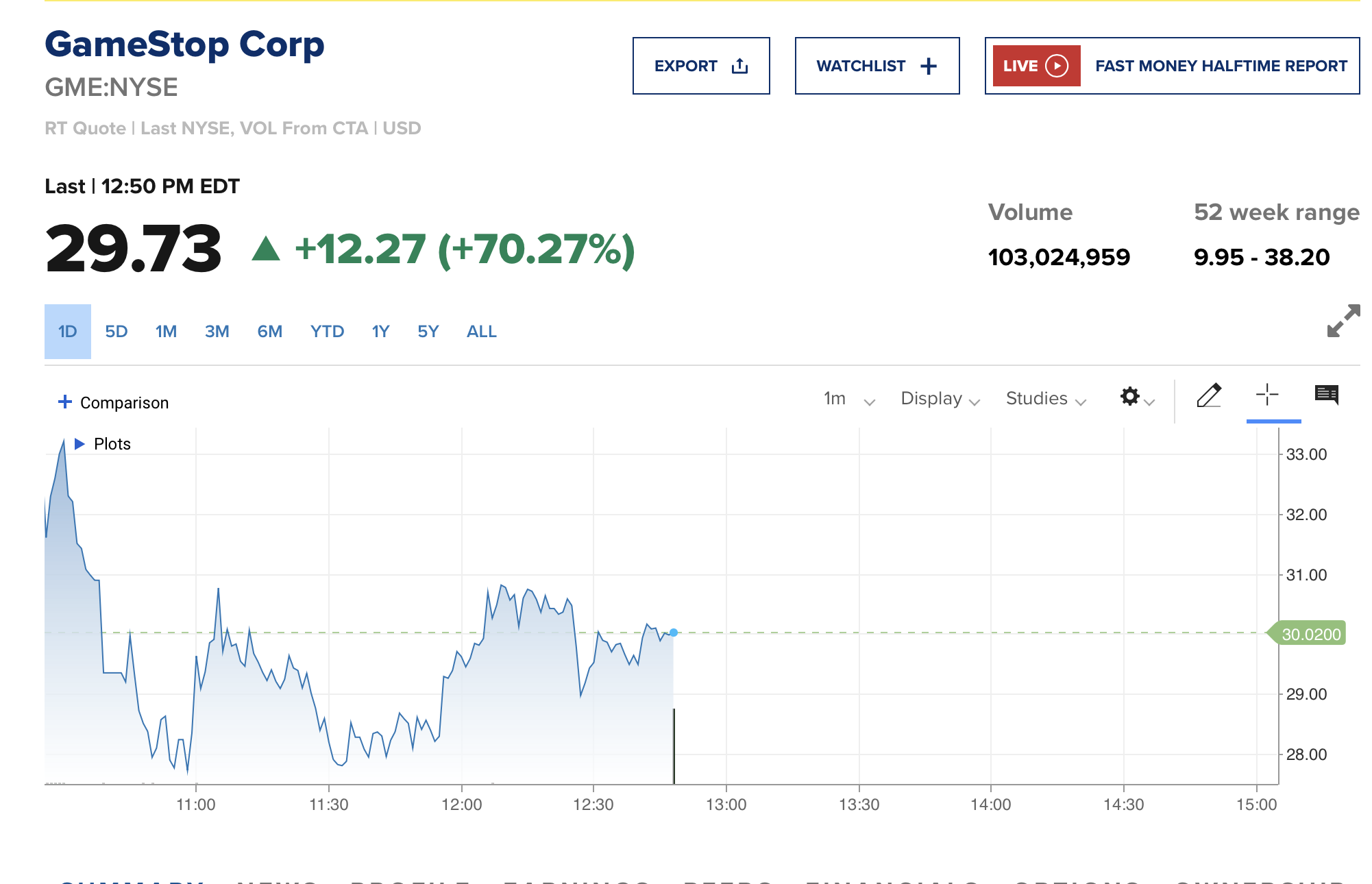 ارتفعت الأسهم في شركة بيع ألعاب الفيديو بالتجزئة GameStop بأكثر من 65% يوم الاثنين بعد نشر Roaring Kitty، الرجل الذي غذى هوس GameStop لعام 2021، عبر الإنترنت على Reddit لأول مرة منذ ثلاث سنوات تقريباً. تم إيقاف التداول عدة مرات بسبب التقلبات.