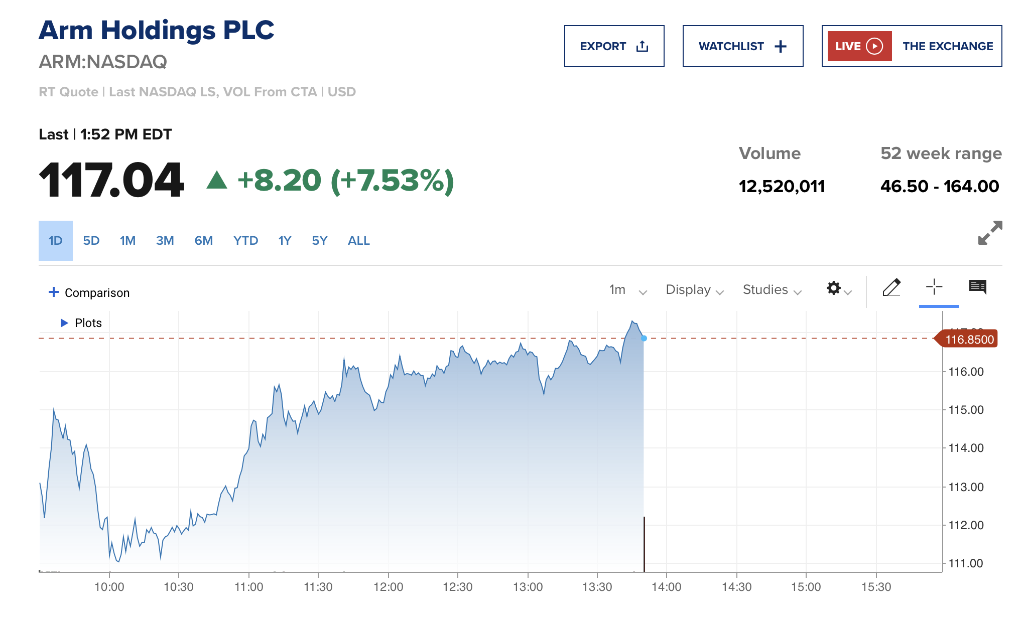 من حركة السهم التي نراقبها في تداولات يوم الإثنين في وول ستريت، أسهم Arm Holdings التي ترتفع قرابة الـ 7% خلال تعاملات جلسة الاثنين في وول ستريت، فوق مستوى الـ 116 دولاراً، وذلك بدعمٍ من الأنباء المرتبطة بتخطيط الشركة لإنشاء وحدة جديدة لشرائح الذكاء الاصطناعي وبناء نموذج أولي بحلول ربيع العام المقبل