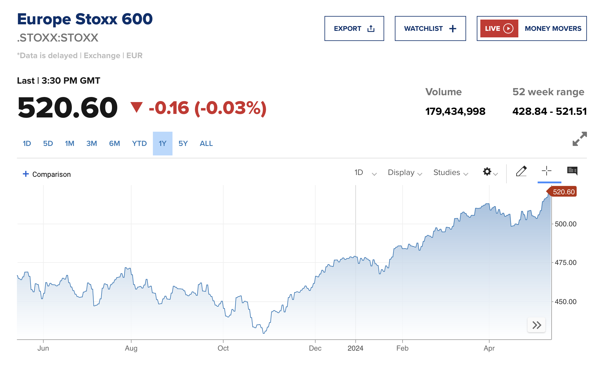 أنهى مؤشر Stoxx 600 الأوروبي التداول منخفضاً بنحو 0.30%، مع وجود البورصات الرئيسية في المنطقة الحمراء. وقادت أسهم البناء والمواد الخسائر، بانخفاض 0.9%، في حين ارتفعت أسهم السيارات 1.4%.