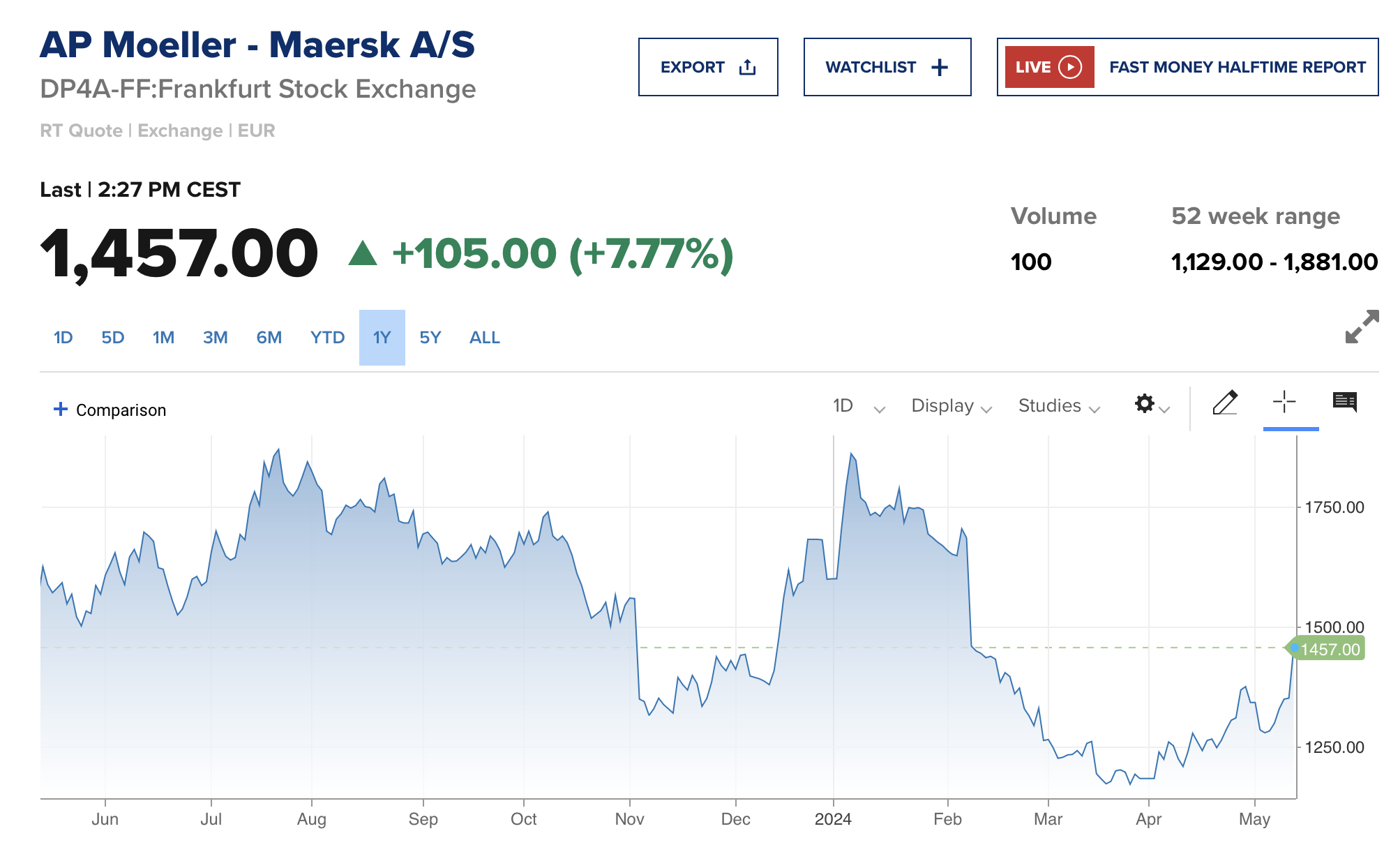 وقفزت أسهم مجموعة ميرسك للشحن 8 بنحو % إلى قمة المؤشر ستوكس 600 مع استئناف التداول بعد يومين.