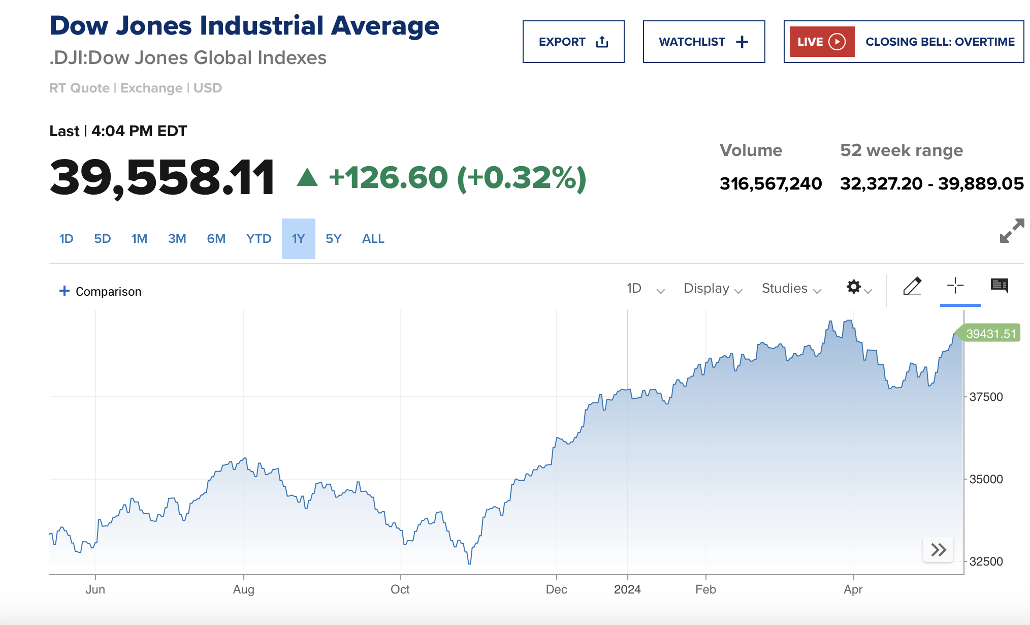 مؤشر داو جونز الصناعي أضاف 149 نقطة أو 0.4% إلى 39,554.66 نقطة.
