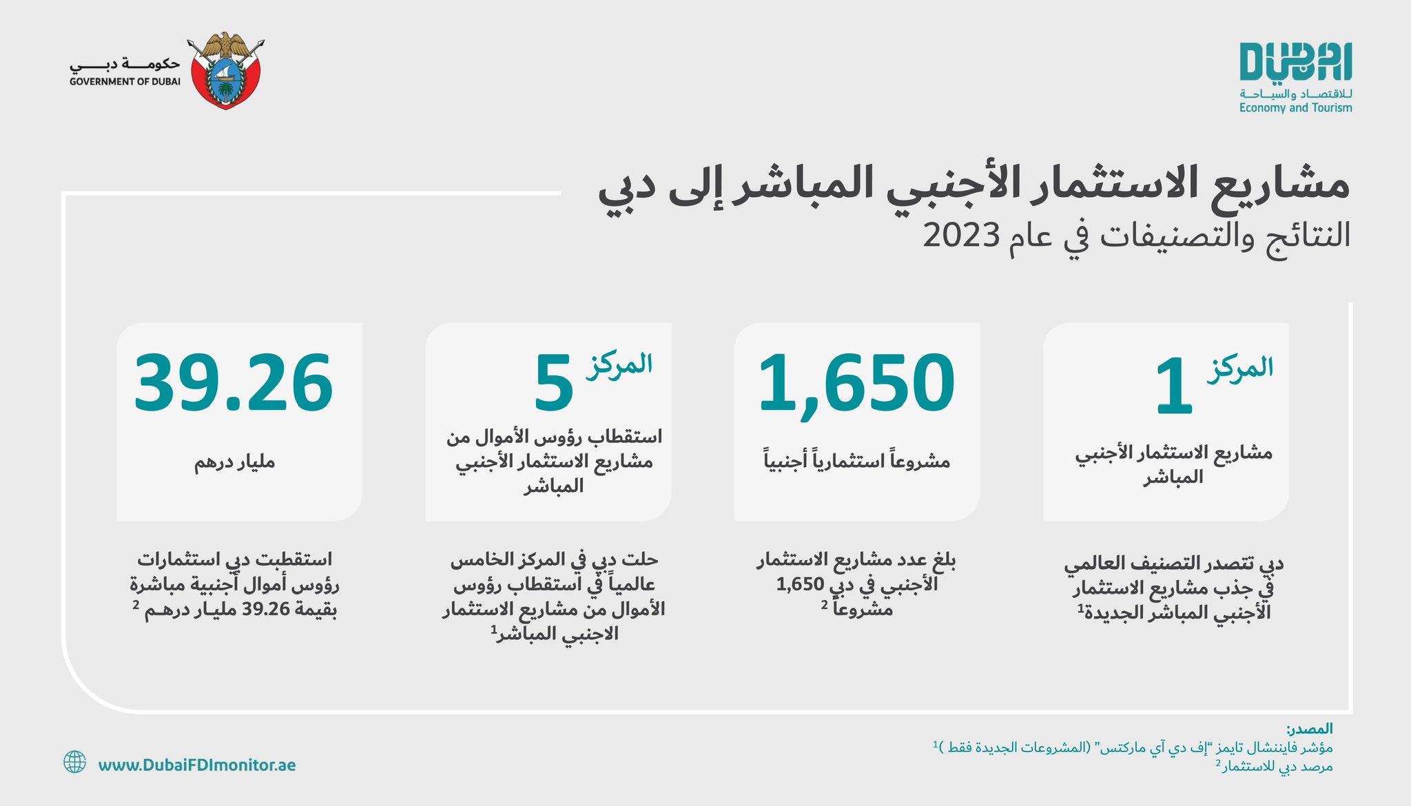 حافظت إمارة دبي على المركز الأول عالمياً في جذب مشاريع الاستثمار الأجنبي المباشر، للعام الثالث على التوالي، وفقاً لبيانات مؤشر "فايننشال تايمز –إف دي آي ماركتس"، بحسب ما ذكره ولي عهد دبي حمدان بن محمد بن راشد آل مكتوم، في منشور على حسابه الرسمي في منصة "إكس"، الثلاثاء.