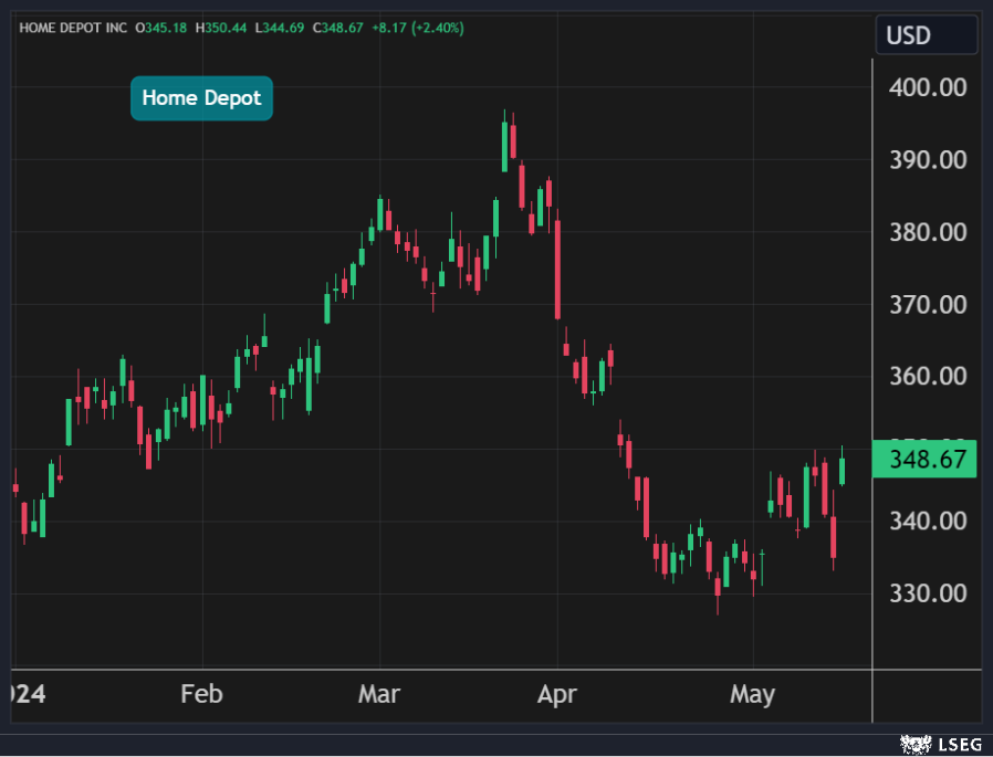 ارتفع سهم Home Depot بنسبة 2.4% في جلسة الأربعاء ليغلق عند أعلى مستوياته في أكثر من شهر.