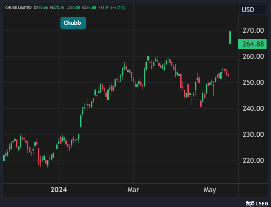 ارتفعت أسهم Chubb السويسرية المدرجة في نيويورك بنسبة 5% في جلسة الخميس ليغلق عند أعلى مستوى في تاريخه.