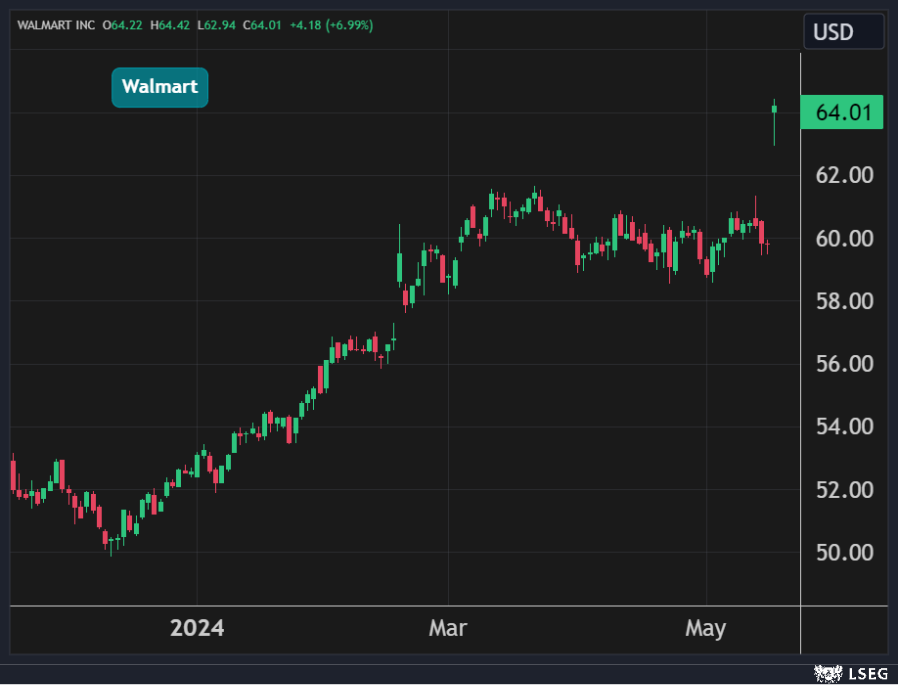 قفز سهم Walmart بنحو 7% في جلسة الخميس ليغلق عند أعلى مستوياته على الإطلاق لتضيف الشركة 34 مليار دولار إلى قيمتها السوقية في يوم واحد.