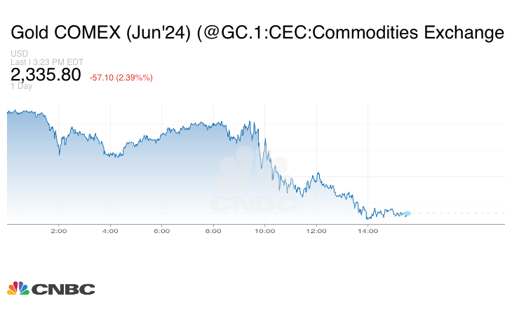 كما انخفضت العقود الأميركية الآجلة للذهب 2.3 % إلى 2337.20 دولار عند التسوية.