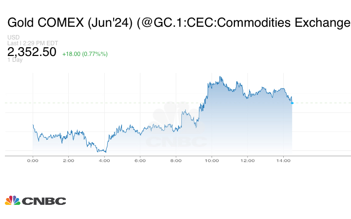 وارتفعت العقود الآجلة للذهب خلال دورة الولايات المتحدة، الإثنين، حسب تصنيف كومكس لبورصة نيويورك التجارية، حيث تمت تجارة العقود الآجلة في يونيو/ حزيران على 2.352.50 للأونصة ارتفع بنسبة 0.77%.