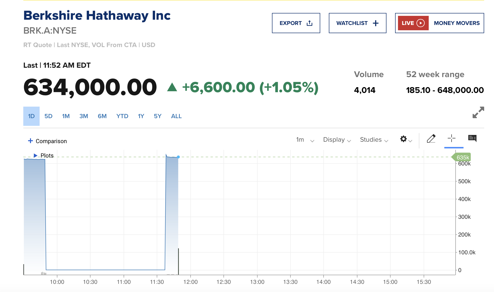 كان هناك أقل من 4000 صفقة مسجلة اليوم لأسهم بيركشاير من الدرجة الأولى عندما توقف التداول. فيما استمر التداول على أسهم الفئة B، التي انخفضت بنسبة تقل عن 1% صباح يوم الاثنين.