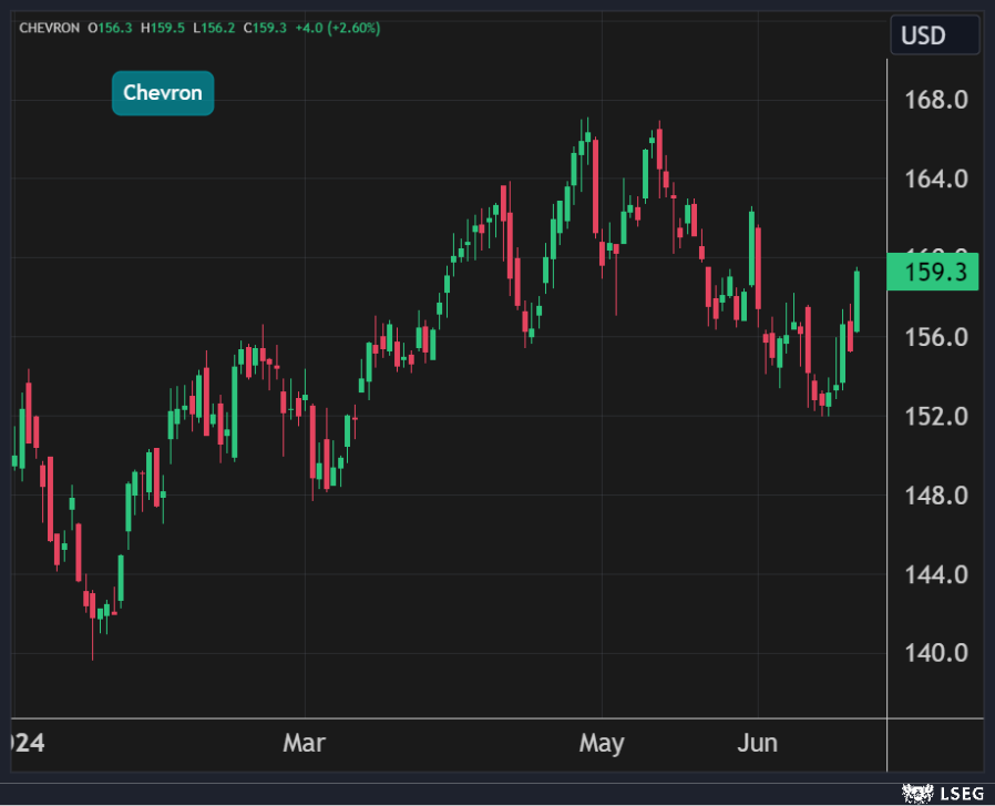 ارتفع سهم Chevron بنسبة 2.6% في جلسة الإثنين مسجلاً أعلى مكاسب يومية في 5 أشهر، وقفز سهم Exxon بنحو 3% محققاً أعلى مكاسب يومية في 8 أشهر.