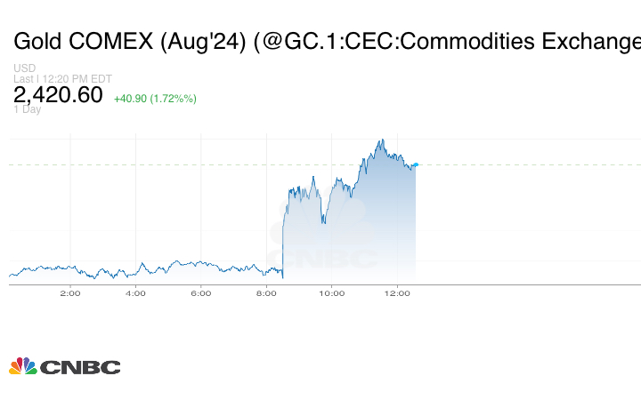 وبحلول الساعة 12:56 بتوقيت غرينتش، صعد الذهب في المعاملات الفورية 1.5% إلى 2406.99 دولار للأونصة، وهو أعلى مستوى له منذ 22 مايو/أيار.
