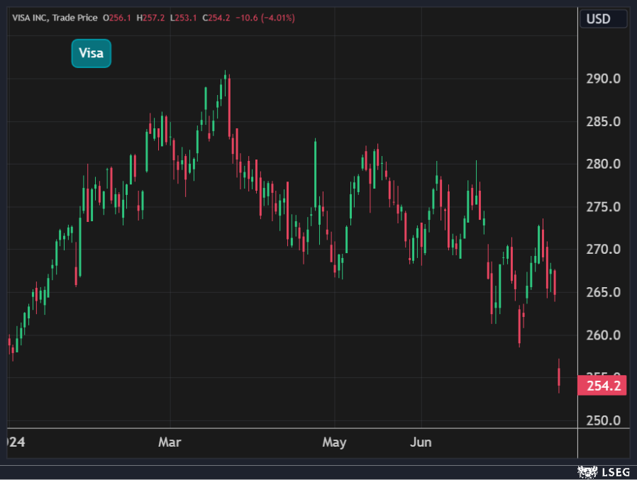 تراجع سهم Visa بنسبة 4% في جلسة الأربعاء إلى أدنى مستوياته منذ بداية العام الحالي بعد أن جاء نمو إيراداتها في الربع الثالث أقل من التوقعات في فشل نادر لأكبر معالج مدفوعات في العالم.