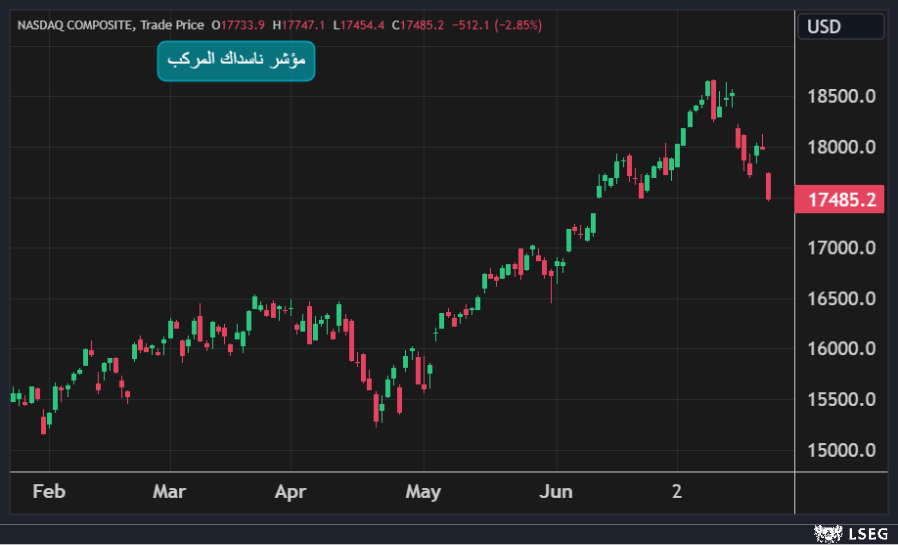 وتراجع مؤشر ناسداك المركب بنسبة 3.6% ليتكبد أكبر خسارة يومية منذ أكتوبر 2022 أي منذ نحو 20 شهراً.