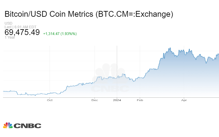 ولامست البيتكوين حاجز 70 ألف دولار لتستقر اليوم في نطاق 69,485 ألف دولار، وسط توقعات باستمرار الارتفاع وسط إقبال على شراء العملة الإلكترونية الأشهر.